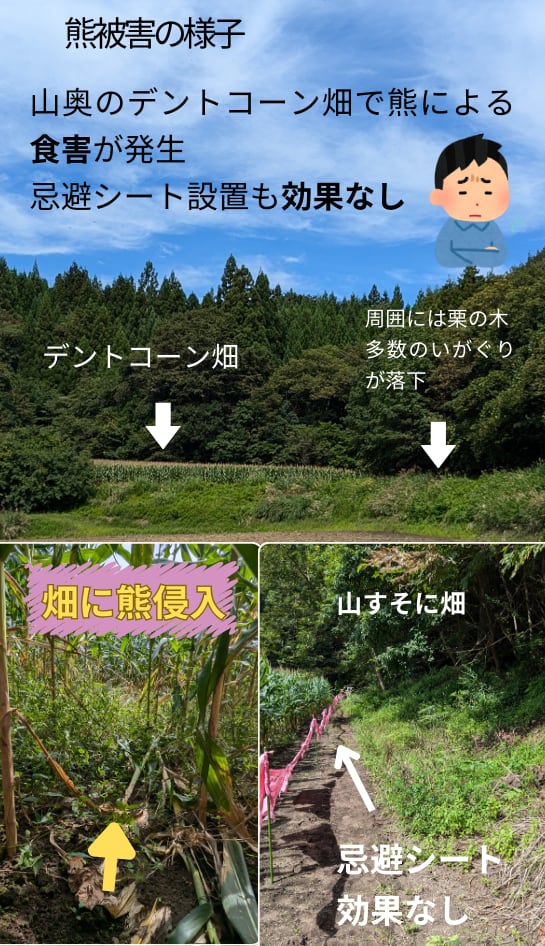 2023年に開発し2024年に熊被害のデントコーン畑で実証実験が行われ新たな被害が発生せず収穫をすることができました。